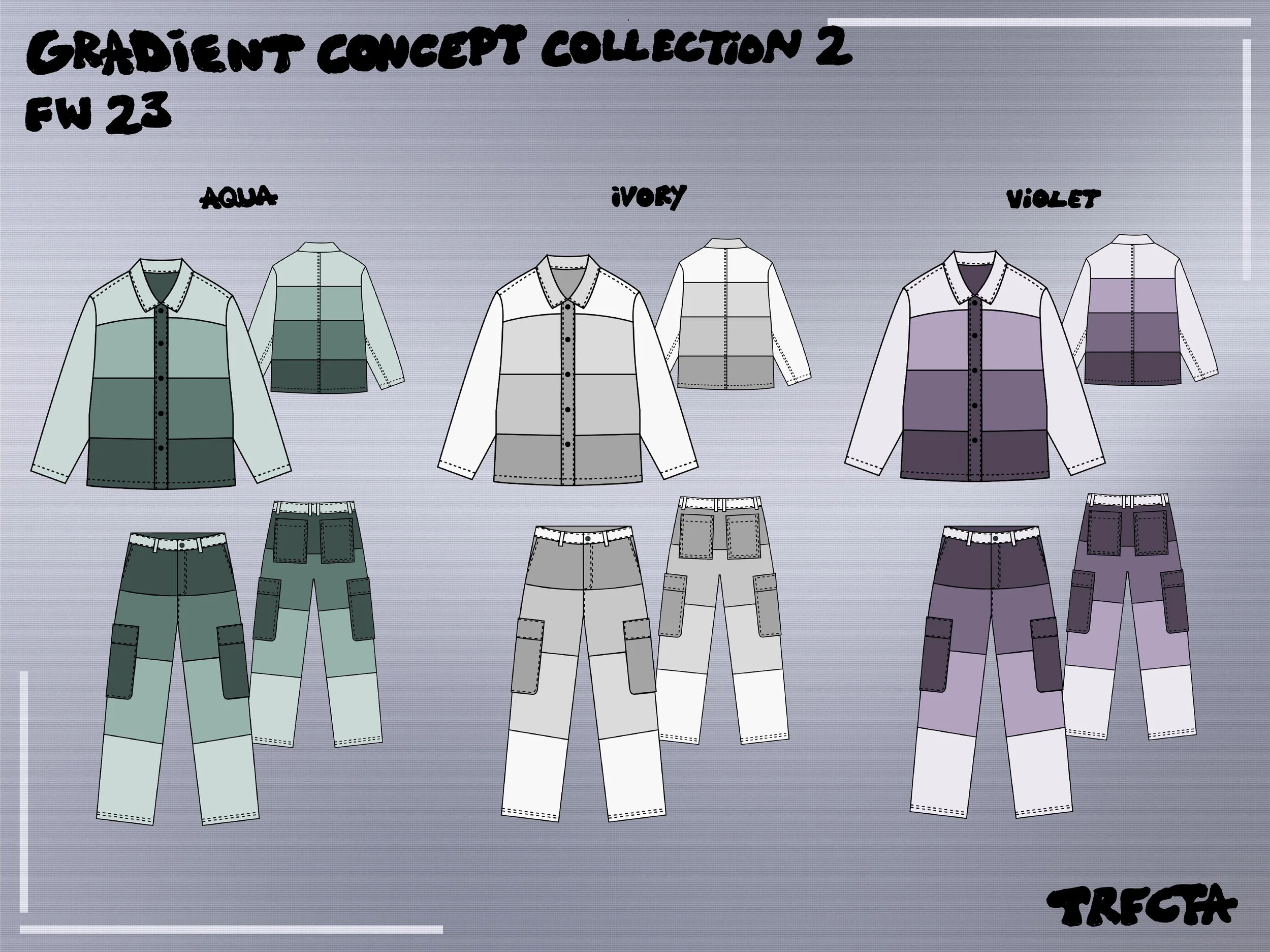 The Gradient Concept Collection is a three-look set consisting of paneled Utility Jackets and Utility Pants. The garments are crafted with 100% cotton canvas with a lining of 100% cotton linen.